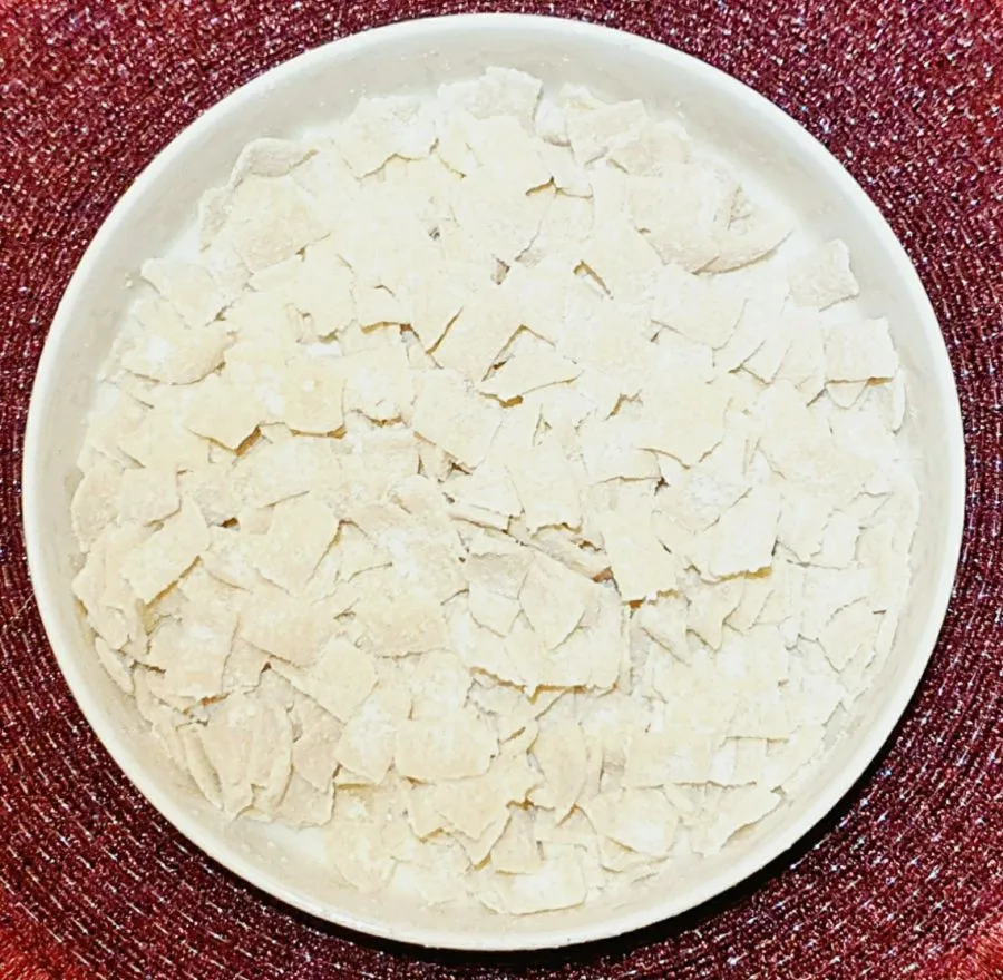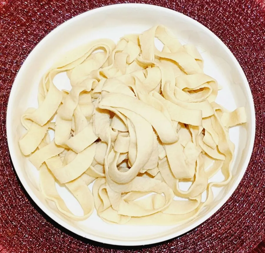 - Bandnudeln mit Bambusfaser einstauben und mit einem Messer in kleinere Fleckerl schneiden. Danach nach Anleitung kochen.