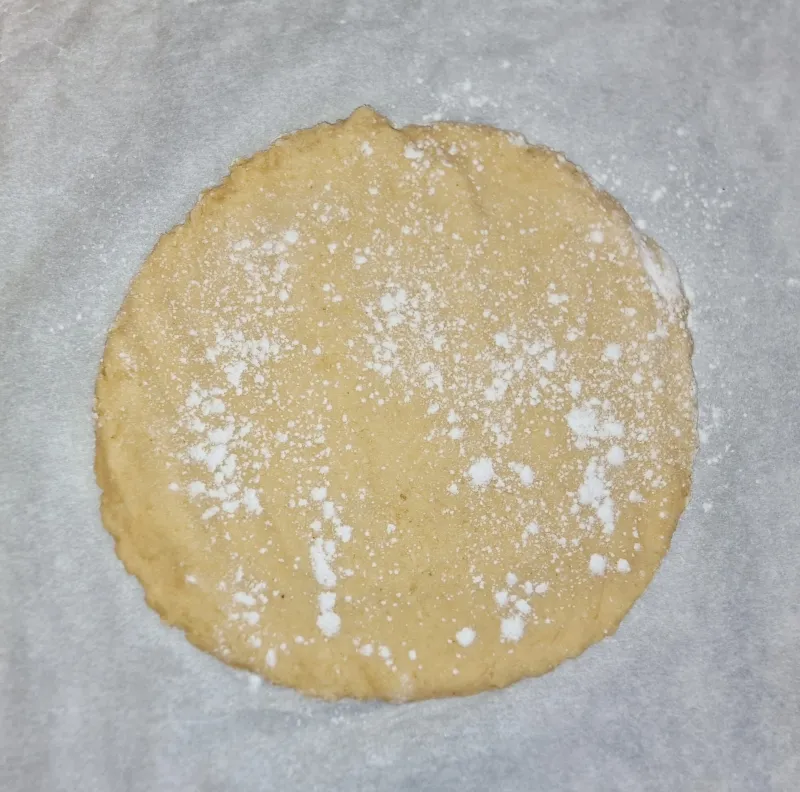 • Für den Boden Ei mit Salz, Muskatnuss und Wasser verquirlen, Mandelteig hinzufügen und einen Teig daraus kneten.
