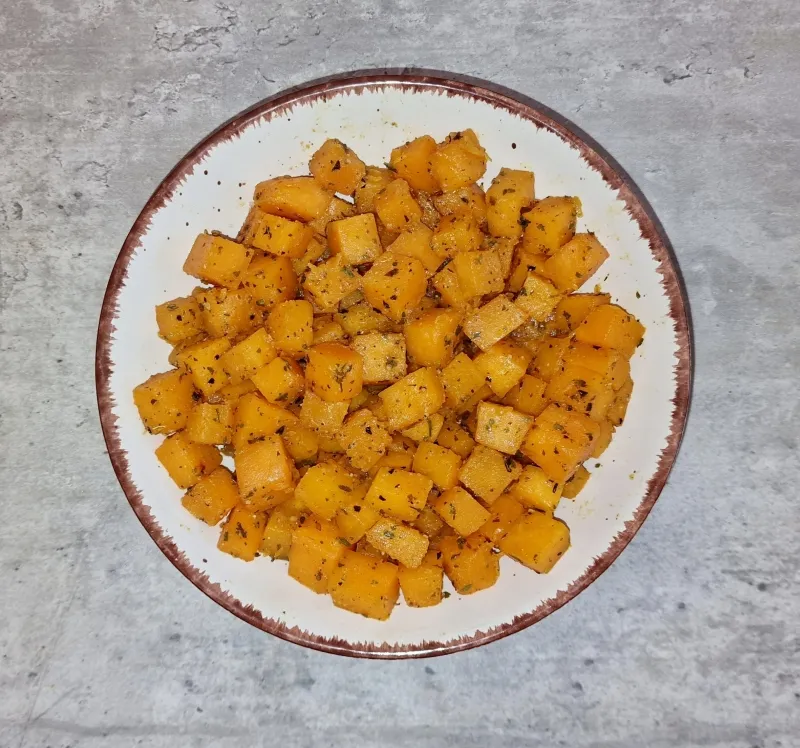 • Kürbis in Würfel schneiden, in einer Pfanne das Butterschmalz schmelzen lassen, den Kürbis mit Gemüseliebling, Bruschetta & Tomate, etwas Salz würzen und kurz anbraten. Etwas abkühlen lassen.