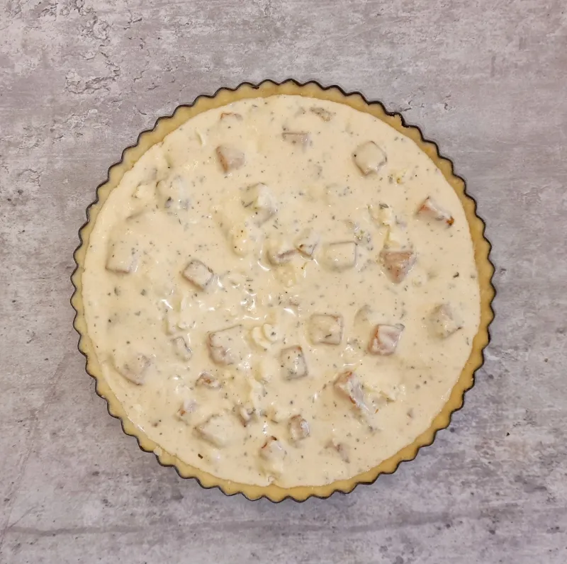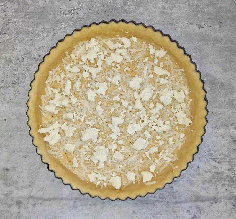 • Geriebenen Käse und Feta auf den Teigboden streuen, dann etwas gewürfelten und das wiederholen. Zuletzt den Guss drüber gießen.