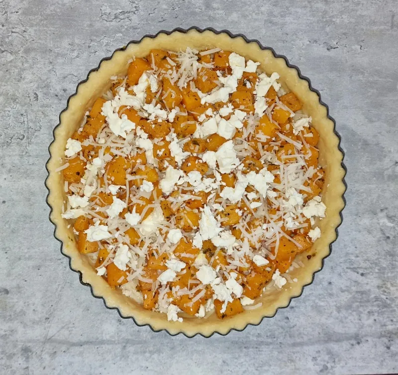 • Für Kürbisfreunde ein Highlight. Quiche mit Kürbis, Saurer Sahne und Feta. Pro Stück nur 3g Kohlenhydrate.