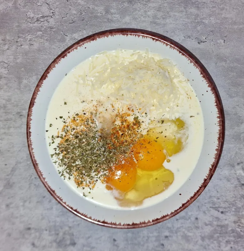 • Für den Guss Ei, Sahne, Sauerrahm, Gewürze und Zitrusfaser, Milch, 1/3 des geriebenen Käse mit einem Mixer verrühren.