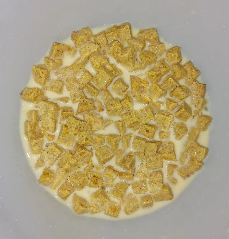 • Milch, Sauerrahm, Eier und Gewürze miteinander verquirlen, über die Brotwürfel gießen, das noch warme Kürbisgemisch hinzufügen, durchrühren. Die Masse gut 45 - 60 Minuten ziehen lassen, gelegentlich durchrühren. Low-carb Brote saugen nicht so stark wie normale Brote.