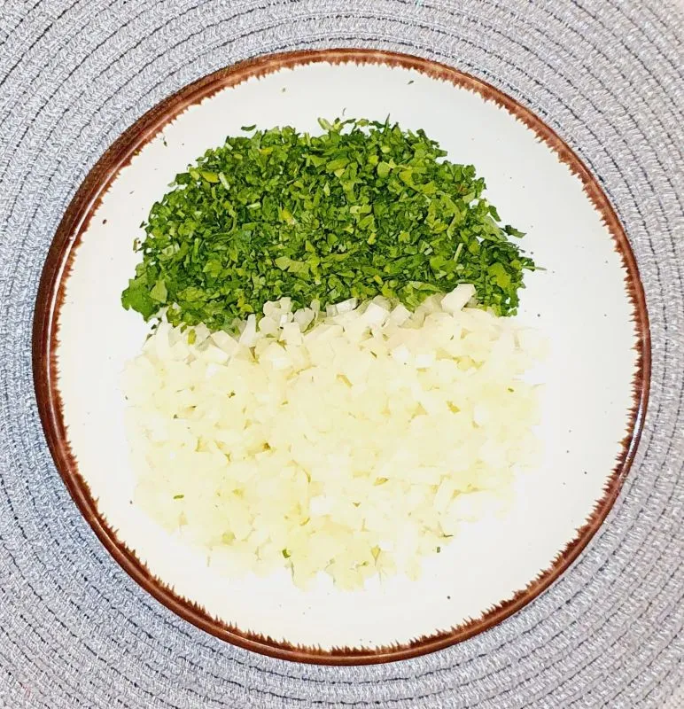 - Zwiebel klein schneiden und Petersilie fein schneiden. Butter in einer Pfanne erhitzen und Zwiebel anrösten, Knoblauch pressen und die Petersilie hinzufügen und kurz mit anbraten. Zur Seite stellen und auskühlen lassen.