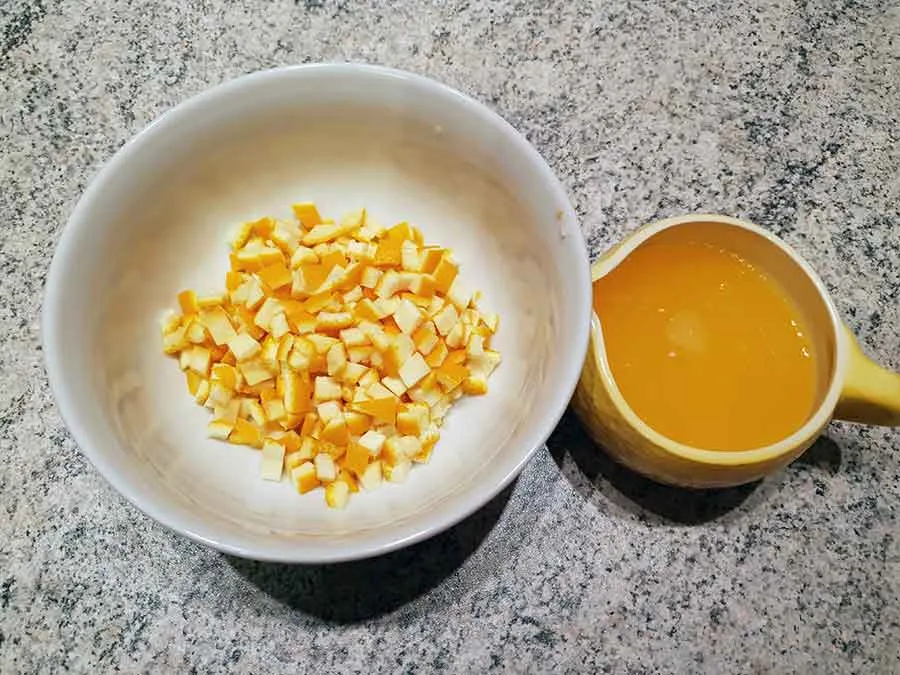 • Die Schalen auf Backpapier verteilen und abkühlen lassen. Für längere Lagerung sollten sie noch einige Stunden getrocknet werden, für die Verwendung in Rezepten können Sie direkt so verwendet werden. TIPP: Für Rezepte empfehlen wir, die Würfel nochmals feiner zu zerhacken (auf ca. 2 mm).