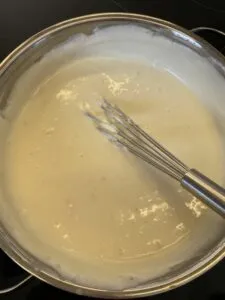 - Sofort Schmand hinzugeben, unter Rühren nochmal erhitzen und rühren bis eine schöne homogene Masse entstanden ist.