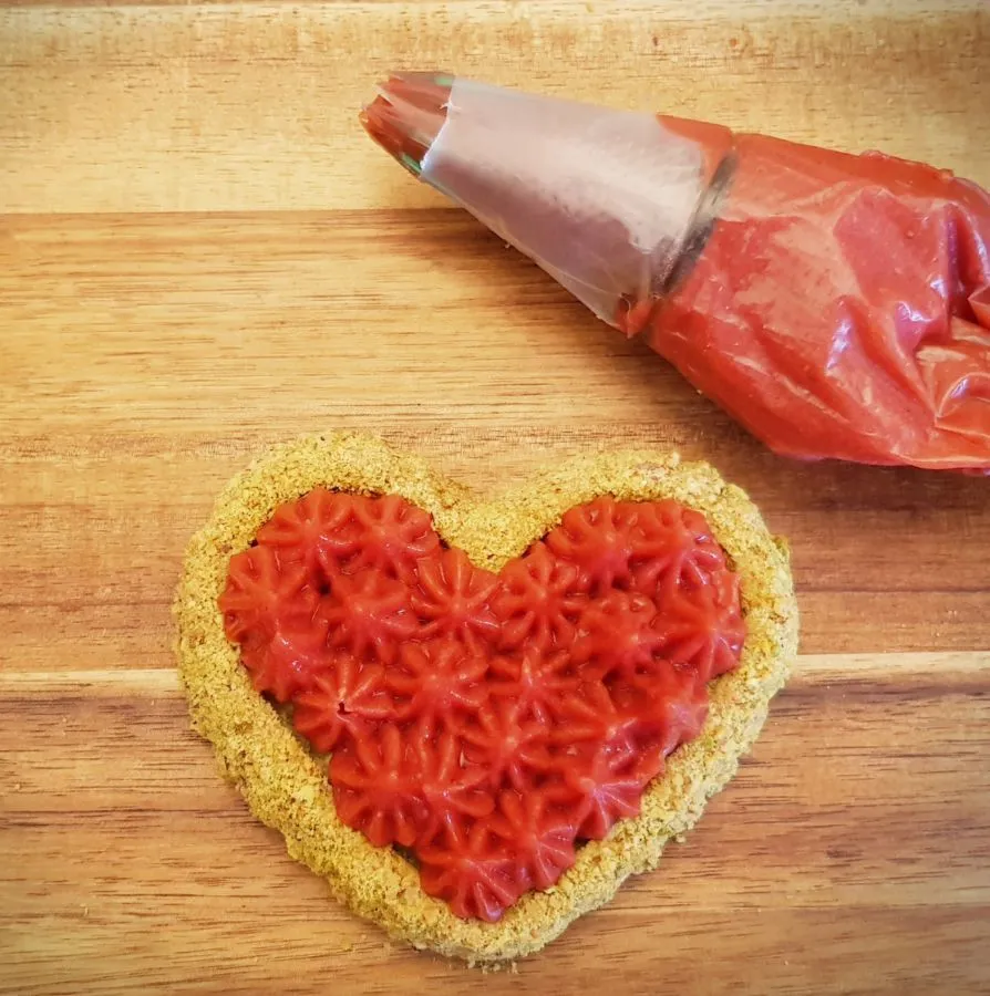 - Die Herzen mit der Erdbeercreme mit Hilfe einer Spritztülle bespritzen!
