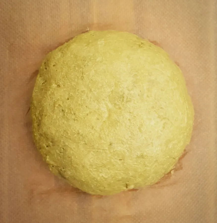 - Ei, Süße und Wasser miteinander vermischen, Mandelteig und Pistazienmus dazugeben und zu einem Teig verkneten.