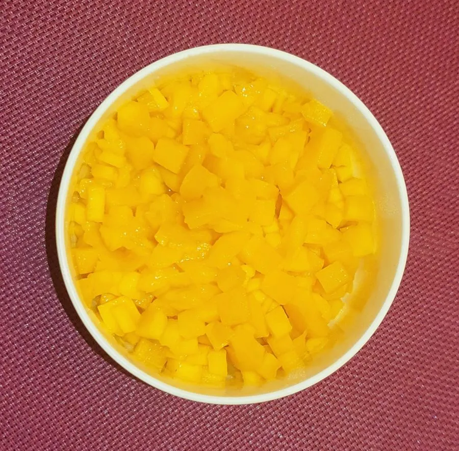 - Für die erste Schicht Mango würfeln und in 100 ml Wasser weichdünsten. Wenn das Wasser verkocht ist, mit Pürierstab pürieren und abkühlen lassen.
