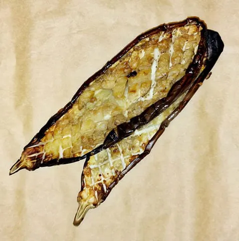 - Aus dem Backofen holen, etwas abkühlen lassen und noch warm mit einem Löffel das Auberginenfleisch ausstreichen. In einen Teller füllen und mit einer Gabel zerstampfen. Abkühlen lassen.