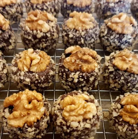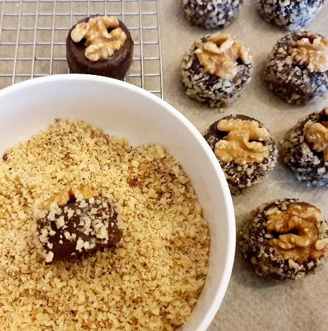 • Wenn die Schokolade angezogen und etwas angetrocknet, gut in den Walnüssen wälzen.