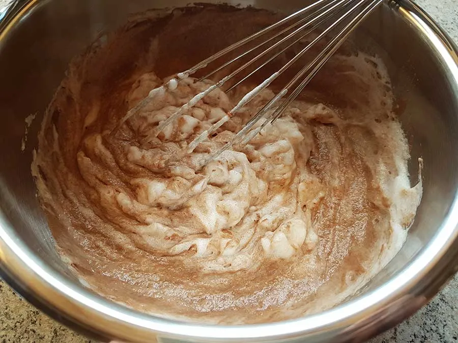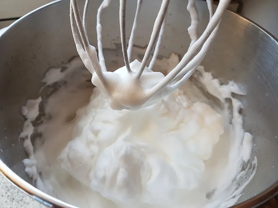 • Anschließend weitere 90 ml Wasser zugeben und klumpenfrei verrühren. Das frisch hergestellte Eiklar zu sehr steifen Schnee schlagen.