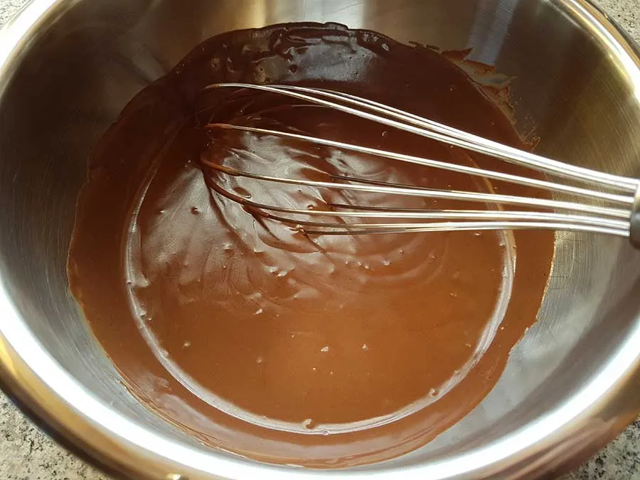 • In der Zwischenzeit Kakaobutter, Kakaomasse und Butter schmelzen. Süße und Aromen unterrühren. ALTERNATIV 110g Schokoladenzauber (Vollmilch oder Zartbitter) mit der Butter schmelzen laut Packungsanleitung.