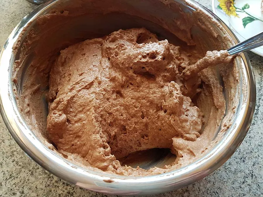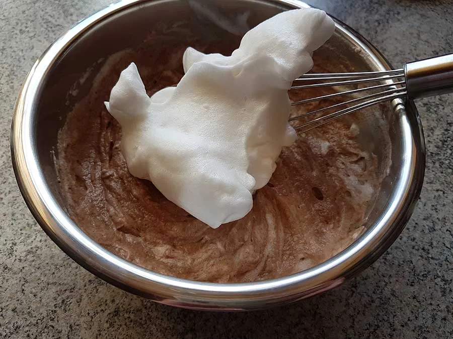 • Die Masse etwas abkühlen lassen und in mehreren Portionen den Eischnee unterheben.