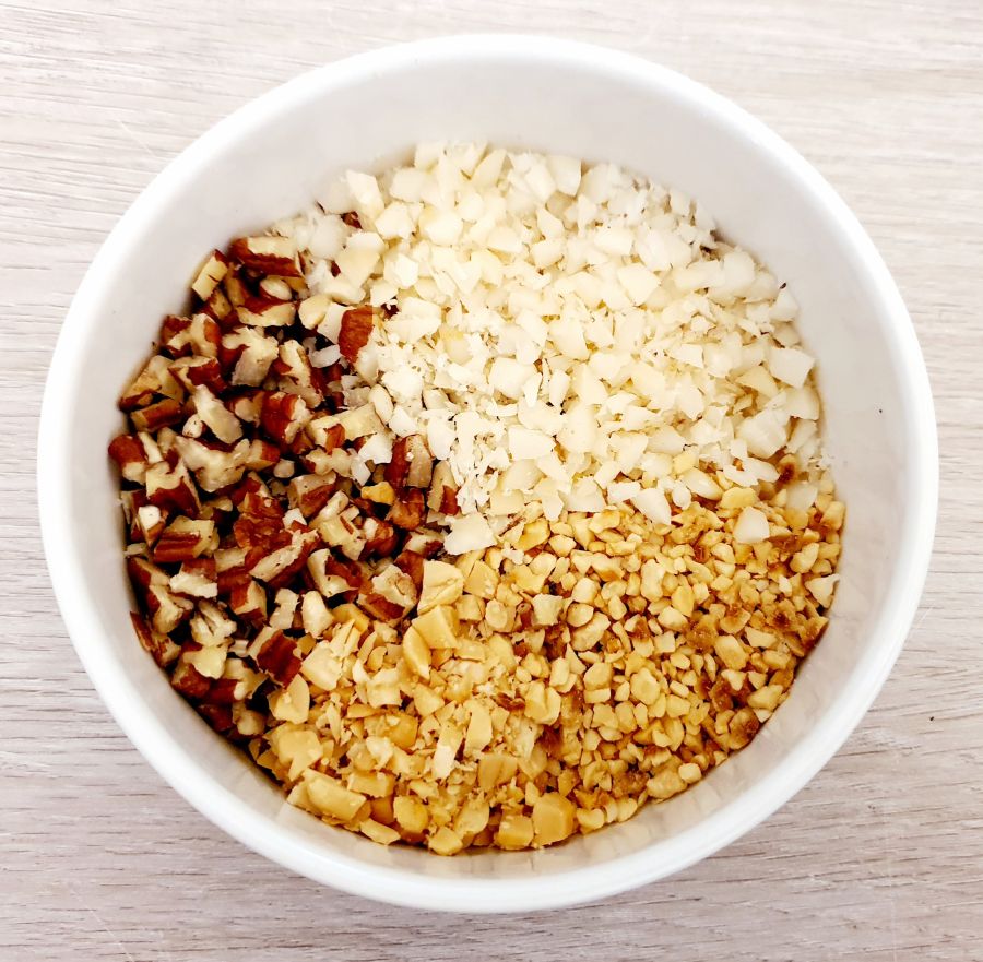 - Macadamia, Pekannüsse, Erdnüsse hacken und die gerösteten gehackten Haselnüsse hinzufügen. Butter in einer Pfanne erhitzen, Karamelltraum schmelzen lassen und die Nüsse kurz karamellisieren. In eine Schüssel füllen und gelegentlich durchrühren, damit sie nicht zusammenkleben.
