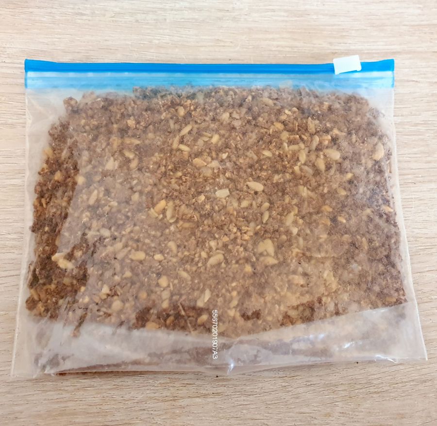 - Gebackenes Müsli in ein Sackerl füllen und mit etwas draufklopfen um sie zu zerkleinern. Müsli & Nussmischung miteinander vermengen.