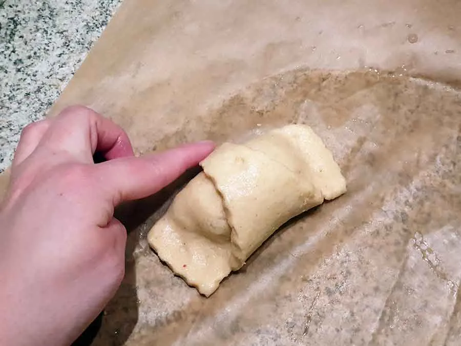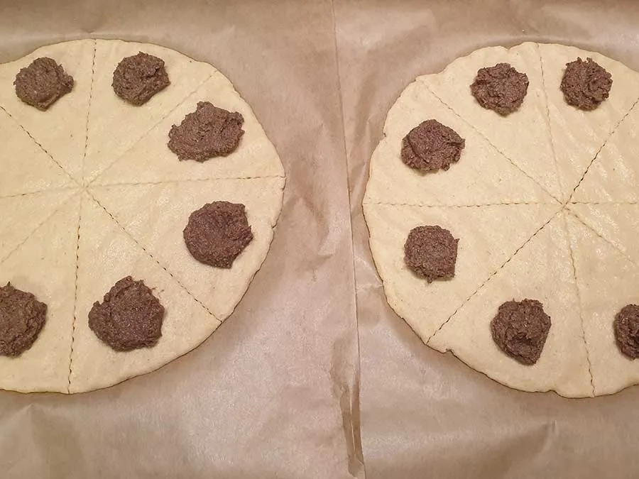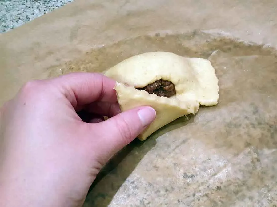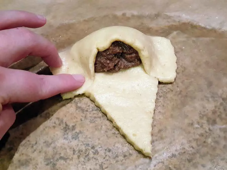 - Auf jedes Stück 1 TL Füllung geben (ca. 2 cm von der äußeren Kante entfernt). Den Teig von außen über die Füllung ziehen und die Kanten gut andrücken. Zum Schluss das dreieckige Stück von der Mitte her überziehen und ebenfalls gut festdrücken.
