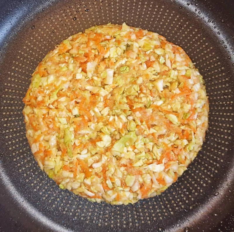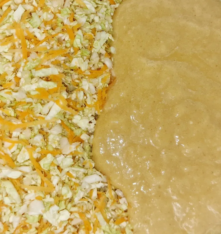 - Brühe, Eier, Salz, Sojasauce, Pfannkuchenmischung und Bambusfaser glatt verrühren. Danach mit der Kohl-Karottenmischung verrühren und für 10 Minuten ruhen lassen.