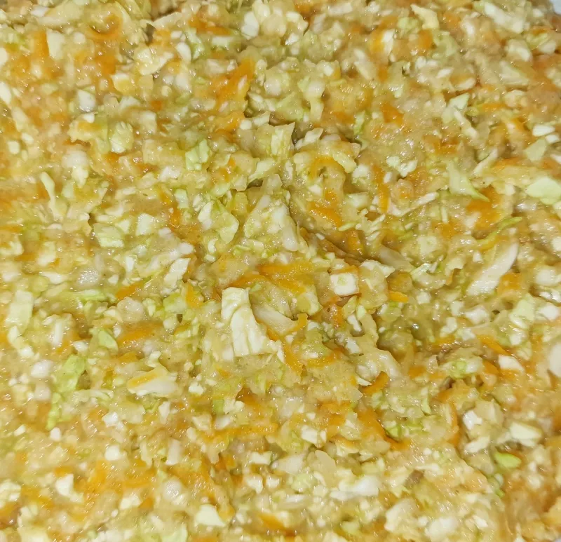 - Karotten fein reiben, Kohl ganz dünn schneiden und dann hacken. Karotten etwas ausdrücken, Kraut etwas massieren und beides miteinander vermengen.