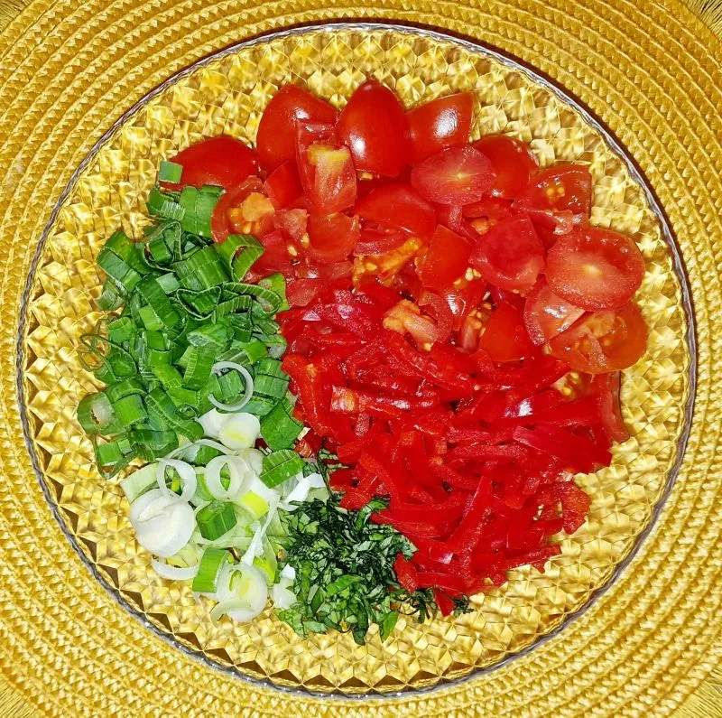 - Für die Fülle Tomaten, Paprika, Zwiebel und Basilikum klein schneiden.