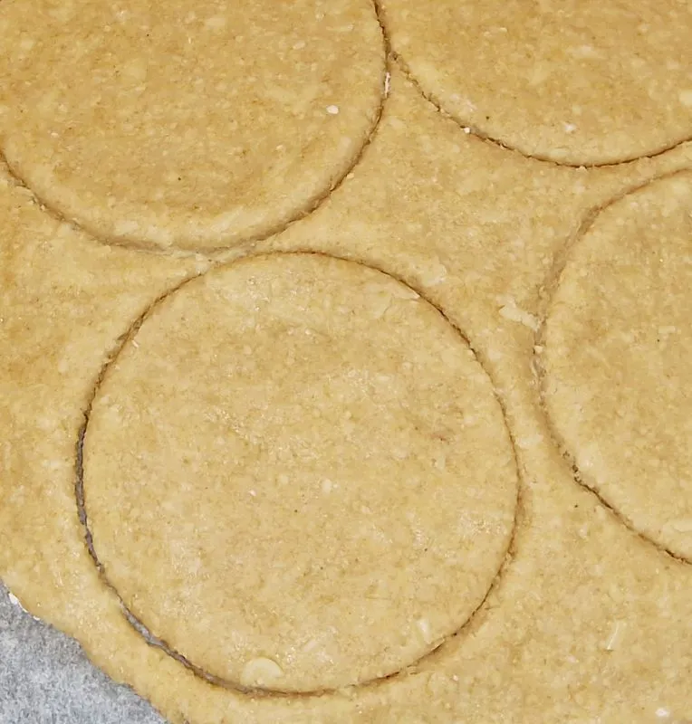 - Den Teig zwischen zwei Blatt Backpapier, welches mit Bambusfaser leicht bemehlt ist, nicht zu dünn ausrollen. Runde Kreise 12 cm ausstechen.