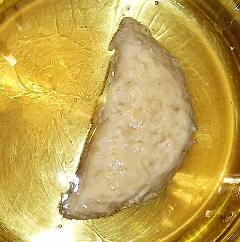 - Den ausgestochenen Kreis etwas flacher drücken und die Ränder mit Wasser bestreichen, 1 EL Fülle mittig auf den Kreis setzen und zusammenklappen.
