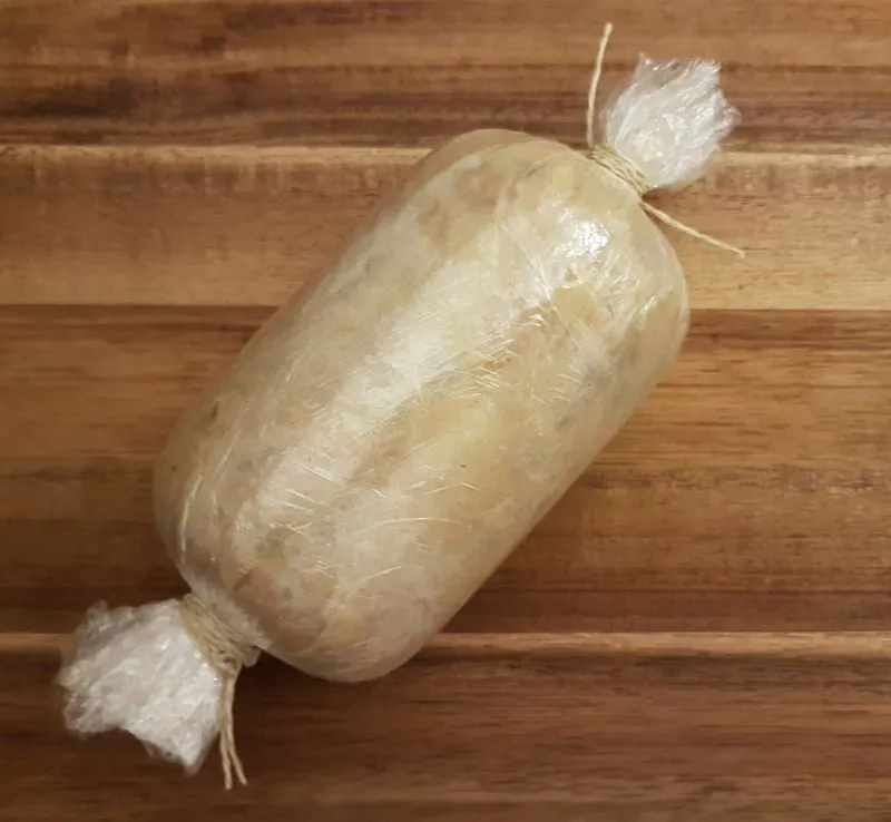 - Die zimmerwarme Butter mit der kalten Pfifferlmischung vermengen und zu einer Rolle drehen. Im Kühlschrank fest werden lassen.