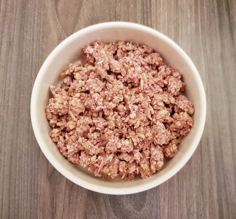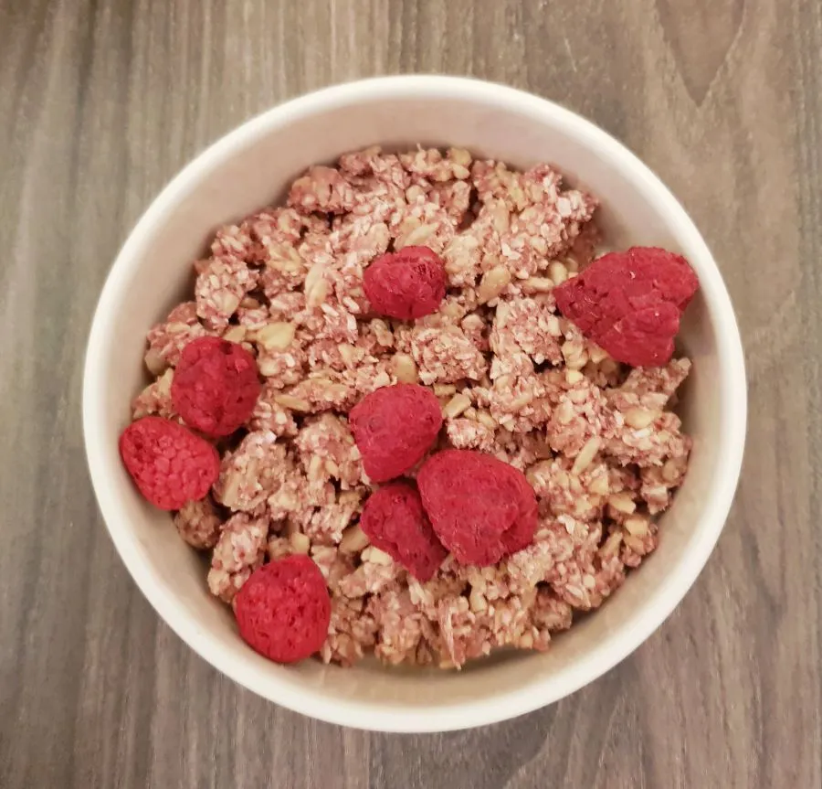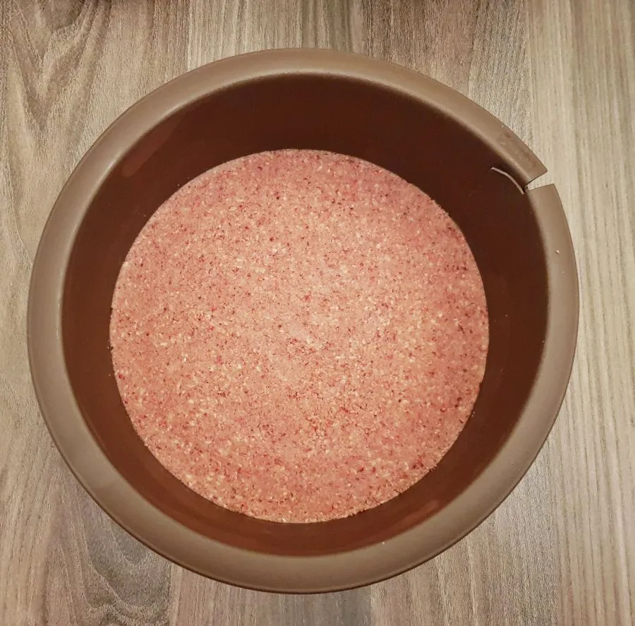 • Gebackenes Müsli und gefriergetrocknete Himbeeren mit einem Multizerkleinerer zerkleinern. Dann in einer Schüssel mit Mandelmehl, Mandelstaub, Butter, Nuketo und Low Carb Kristallin gut miteinander vermengen.
