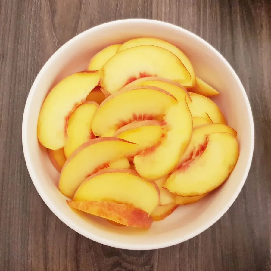 • Für die Deko die Pfirsiche gleich wie die Fülle zubereiten. Wieder abtropfen und dann mit Küchenrolle die Spalten trocknen.