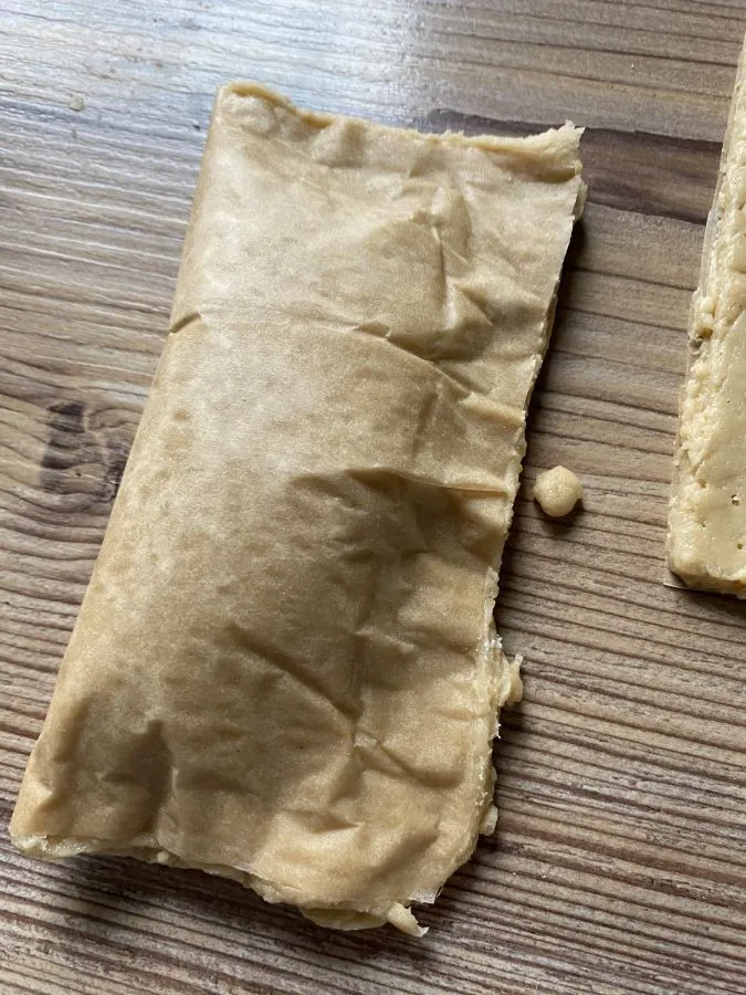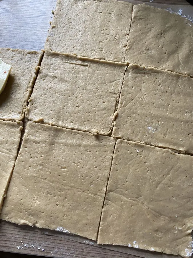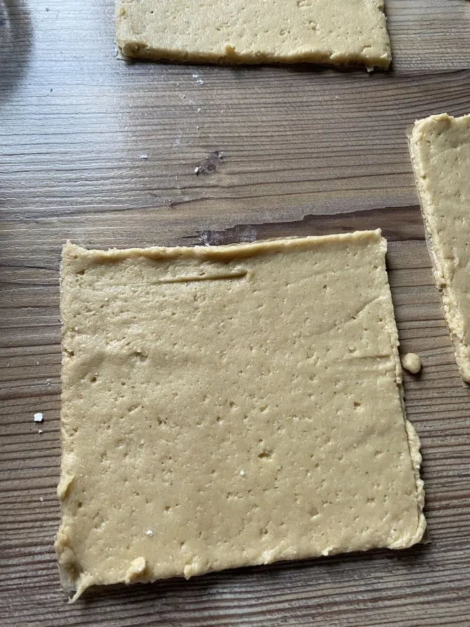 • Mit einem Teigroller 9 Rechtecke schneiden. Mit einer Schere auch das darunter liegende Backpapier in Quadrate schneiden, so kann man die Quadrate wunderbar zu Taschen falten!