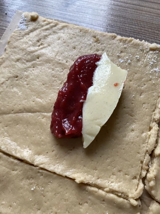 • Jeweils in die Mitte des Rechtecks etwas Pflaumencreme und etwas gekochten, abgekühlten Pudding geben. Für das Rezept Pflaumencreme und Pudding oben auf die Zutat klicken! Ihr kommt dann zum Rezept!