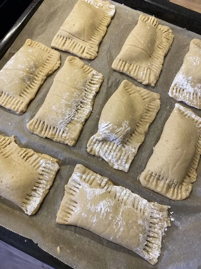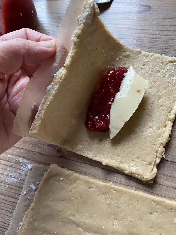 • Mit Hilfe des Backpapiers die Rechtecke hochklappen und zur Tasche falten. Backpapier abziehen. Mit einer Gabel an den 3 Seiten festdrücken. Die Taschen auf ein mit Backpapier ausgelegtes Backblech legen.