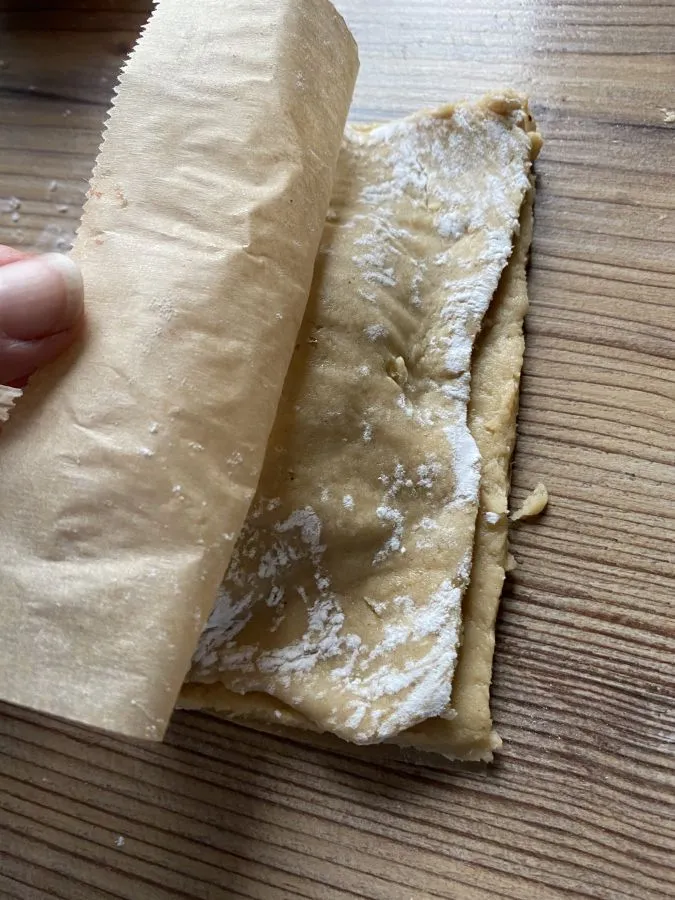 • Den Teig auf Backpapier in Größe des Backbleches geben und mit feuchten Händen ein kleineres Quadrat formen. Eine zweites Blatt Backpapier auf das Rechteck legen und zu einer Größe wie ein normales Backblech ausrollen.