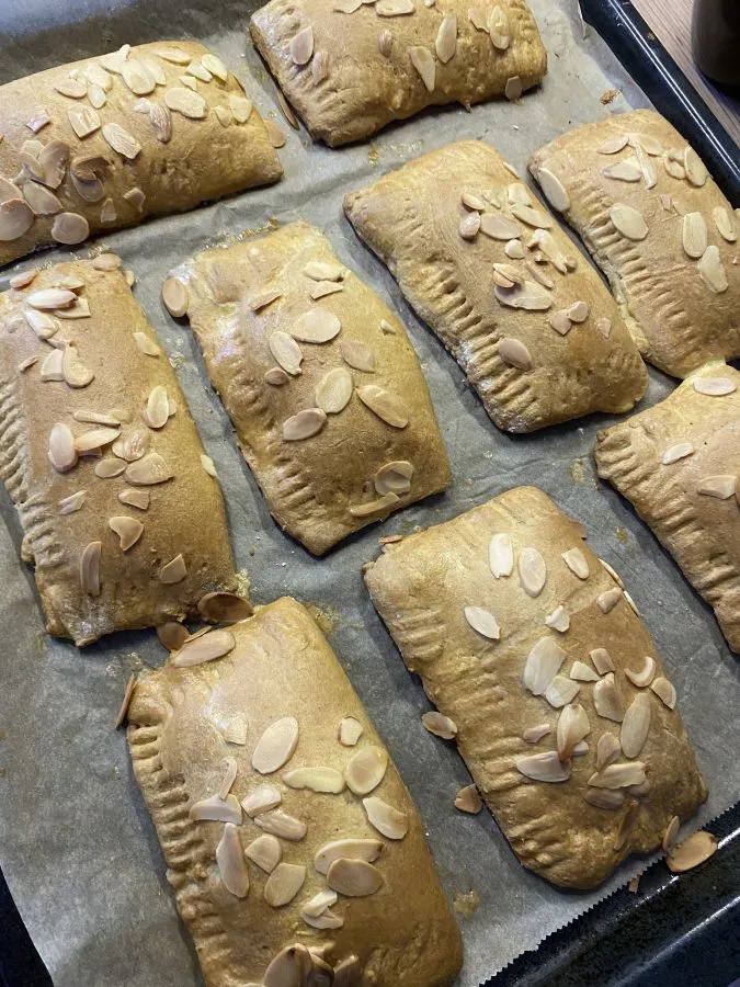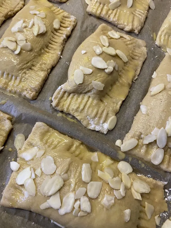 • Das Eigelb mit dem Wasser verrühren und die Hälfte mit einem Pinsel auf den Taschen verstreichen. Mit den Mandeln bestreuen.