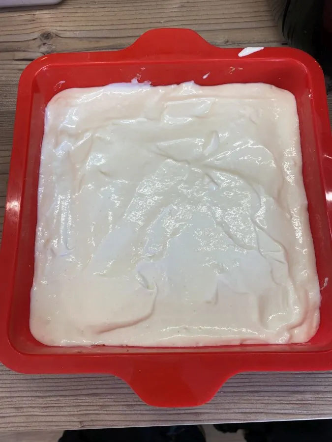 • Die Pudding-Schmandmasse auf den Stollenboden geben.