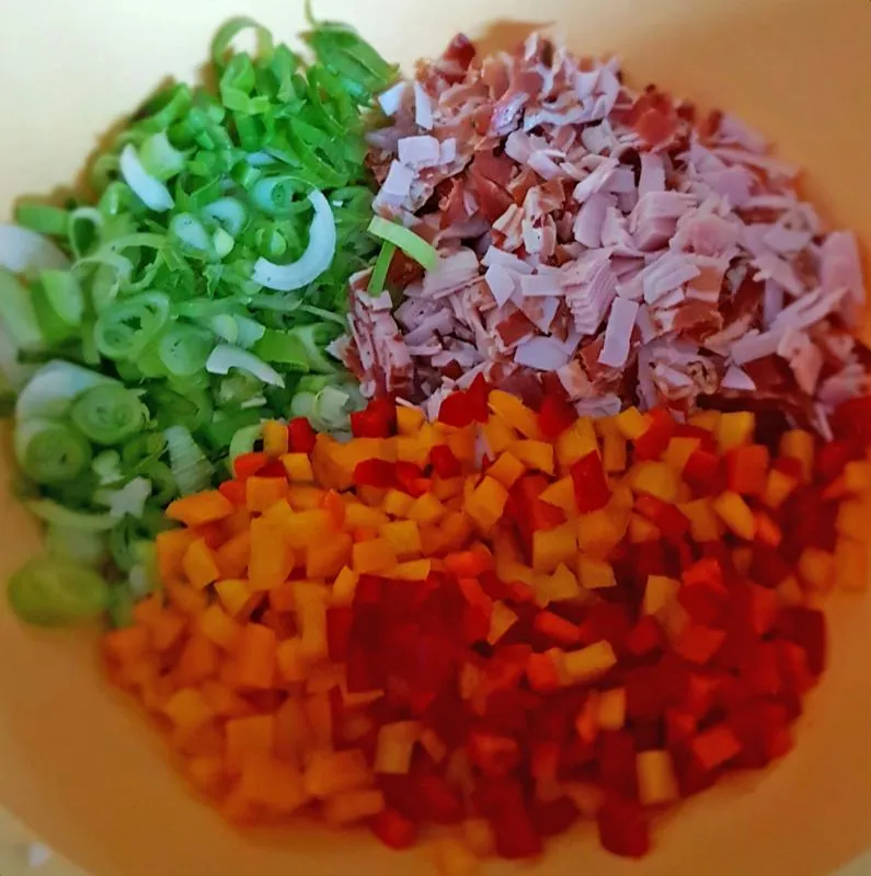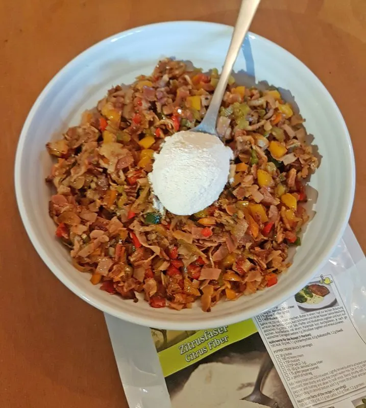- Für die Paprika-Schinken-Fülle Paprika und Frühlingszwiebel waschen und kleinschneiden, Schinken und Speck ebenfalls klein schneiden. Mit Ghee oder Butter anbraten und nach Geschmack mit Taco und Salsa abschmecken. Mit 1 gehäuften Esslöffel Zitrusfaser vermengen. Auch zur Seite stellen.