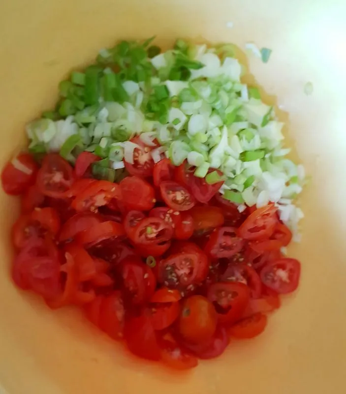 - Für die Tomatenfüllung Tomaten und Frühlingszwiebel waschen, in Scheiben schneiden. Mit etwas Ghee oder Butter anbraten, salzen und mit 1 gehäuften Teelöffel Taco & Salsa würzen, abschmecken. Die Flüssigkeit verkochen lassen und mit einem gehäuften Esslöffel Zitrusfaser vermengen. Die fertige Fülle zur Seite stellen.
