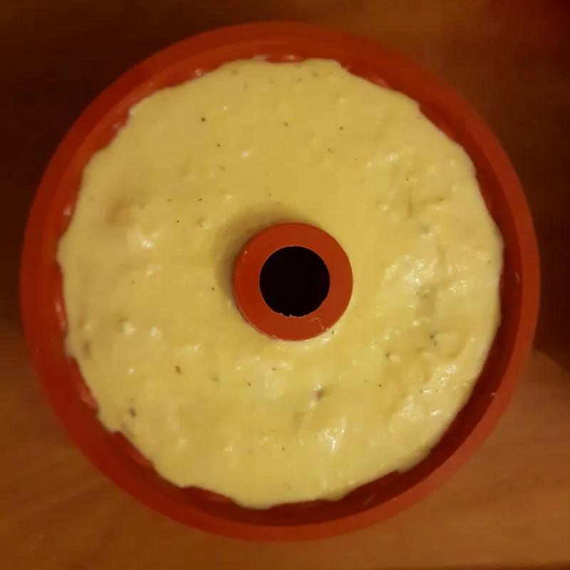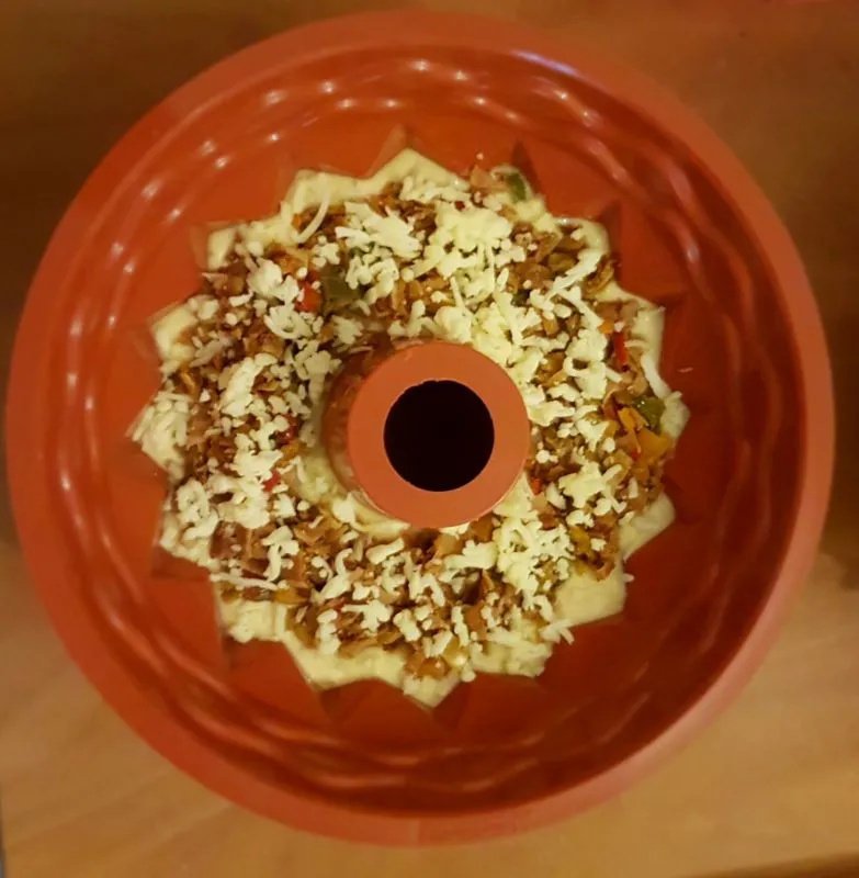 - In eine Gugelhupfform (am Besten eignet sich Silikon) etwas vom Teig einfüllen und die Tomatenfülle mit einem Löffel auf den Teig setzen, mit etwas gerieben Mozarella bestreuen.
