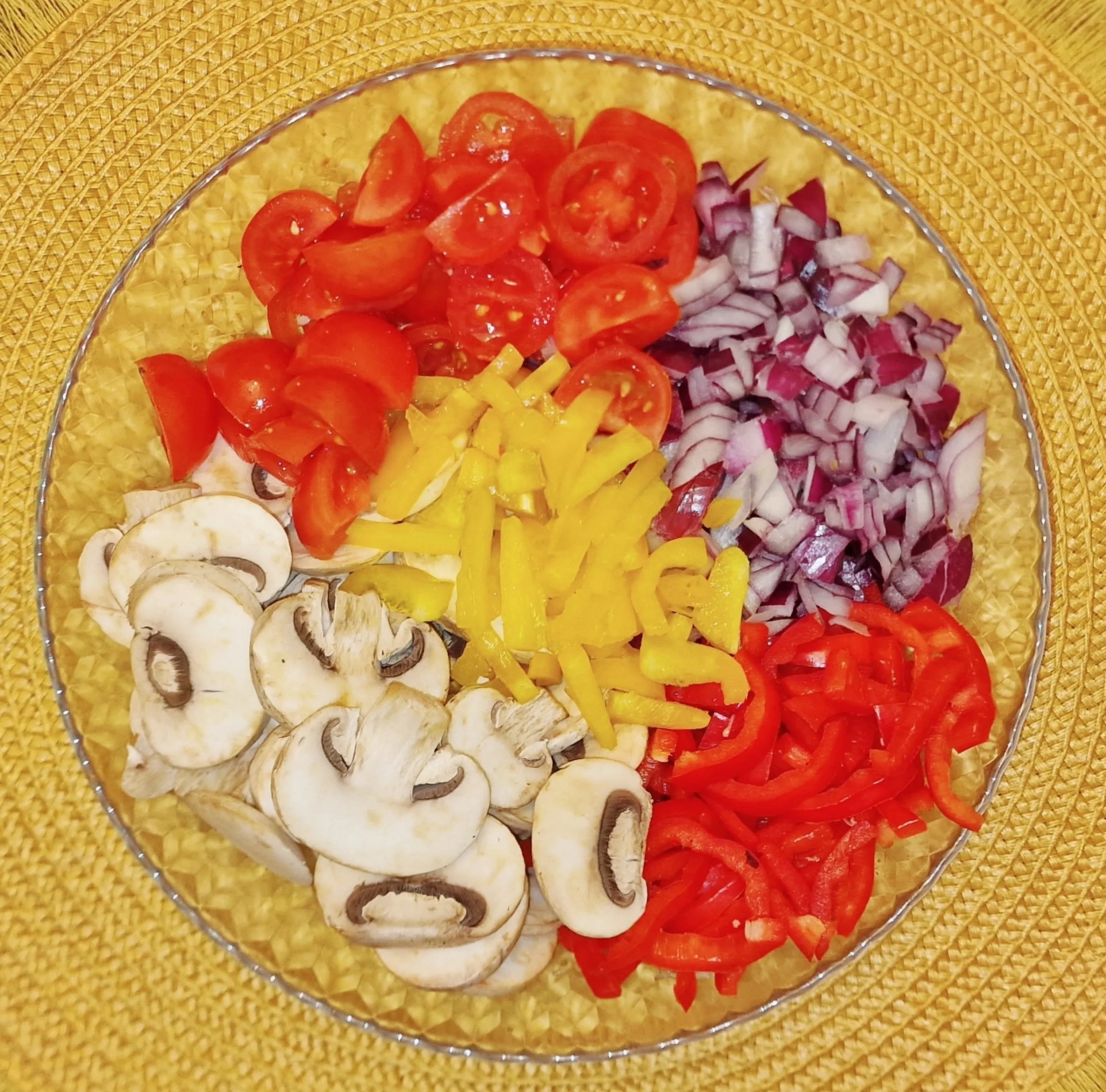 - Zwiebel, Paprika klein würfeln, Champignons in Scheiben schneiden, Knoblauch pressen, Tomaten vierteln.