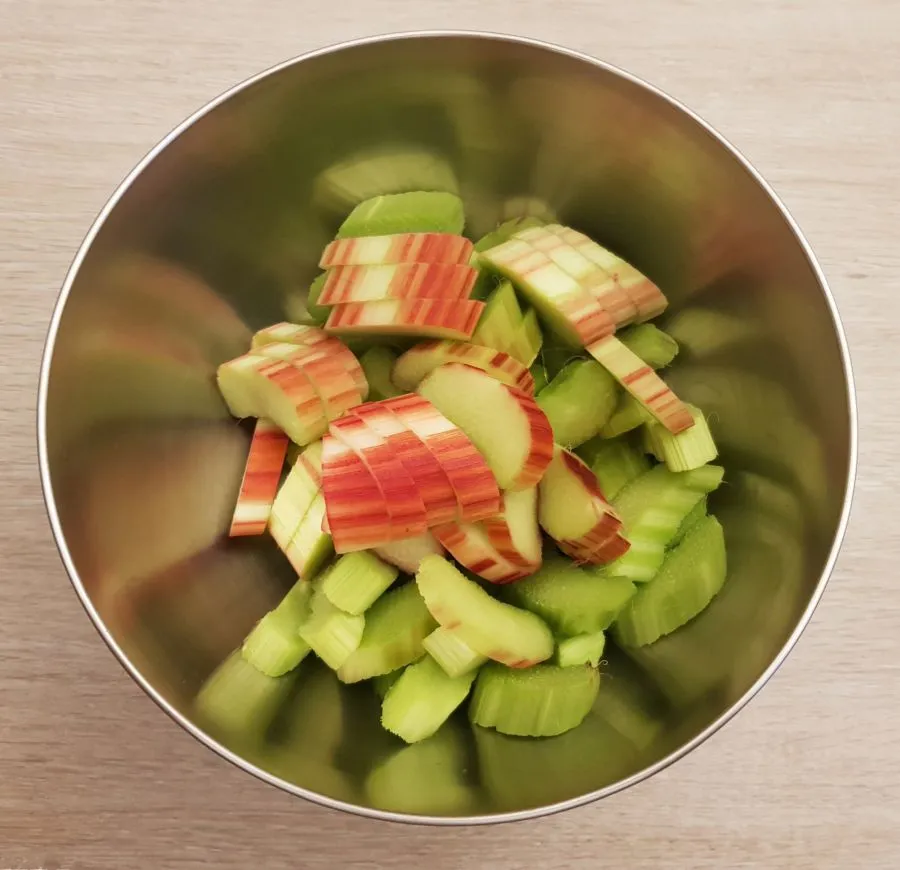 - Rhababer dünn schälen und in kleine Stücke schneiden.