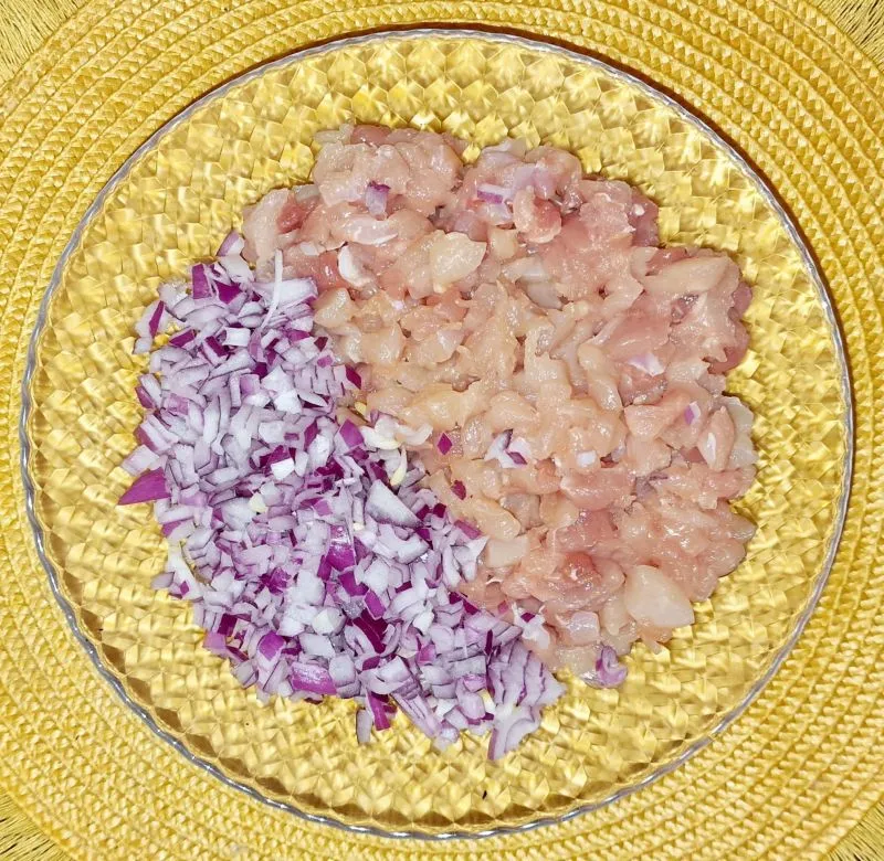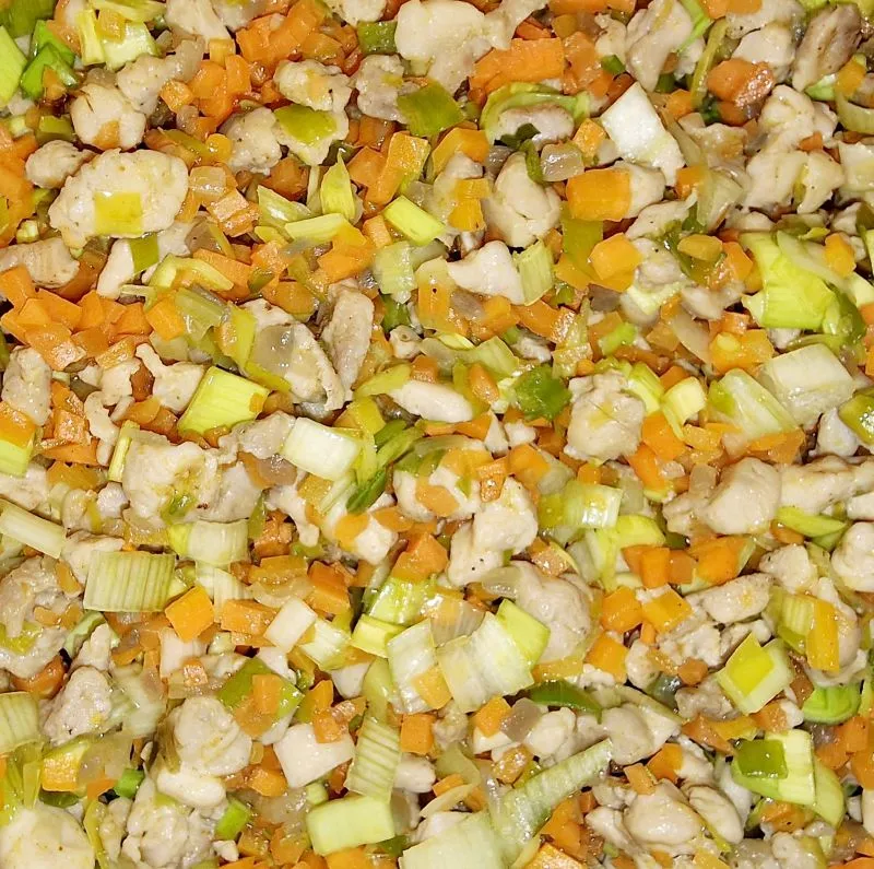 - Hühnerfleisch ganz klein schneiden, Karotten sehr klein würfeln, Zwiebel fein schneiden und den Lauch im kleinere Würfel schneiden.