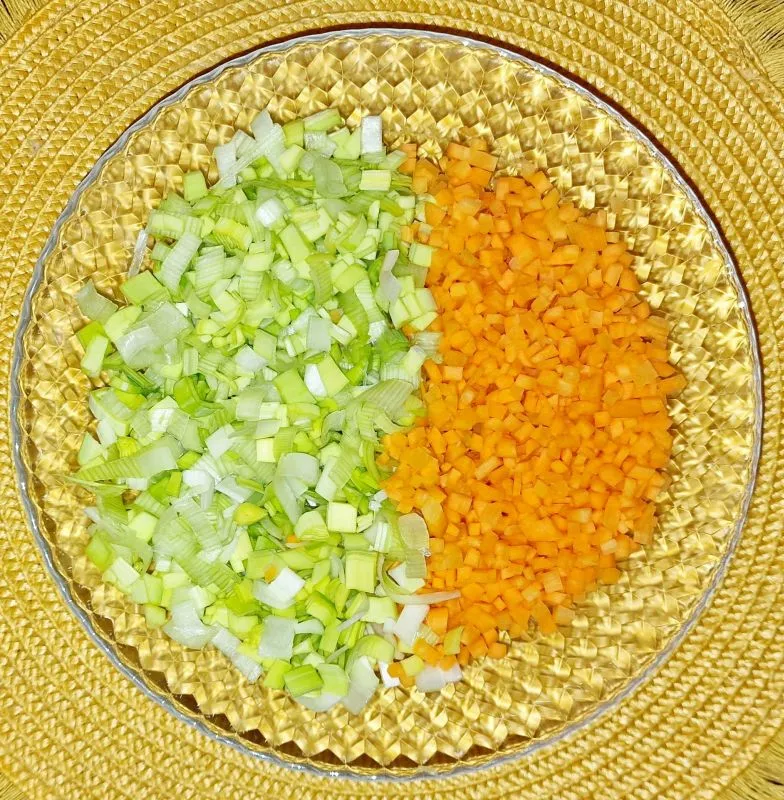 - In eine Schüssel füllen, dann Zwiebel und Karotten anbraten und zum Schluss den Lauch mit anbraten.