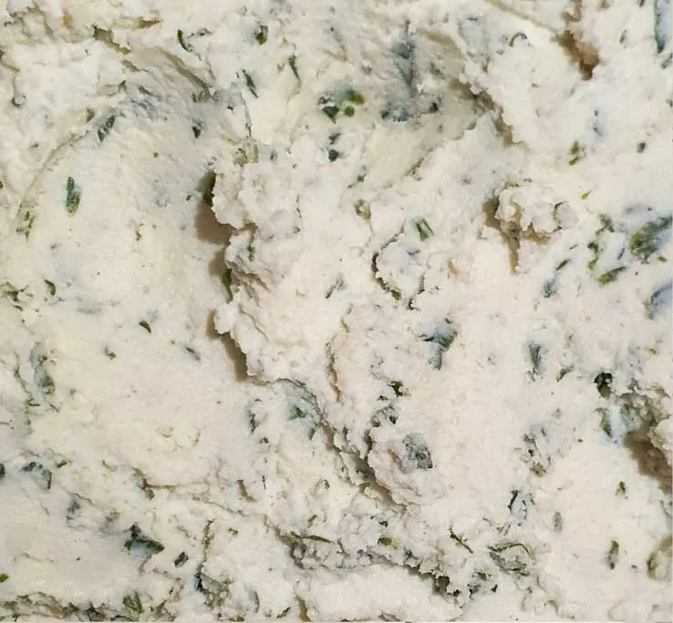 - Für die Fülle Ricotta, Zitrusfaser, Schnittlauch und Gewürze mit einem Löffel gut miteinander vermengen. Die Masse in einen Spritzsack ohne Tülle füllen.