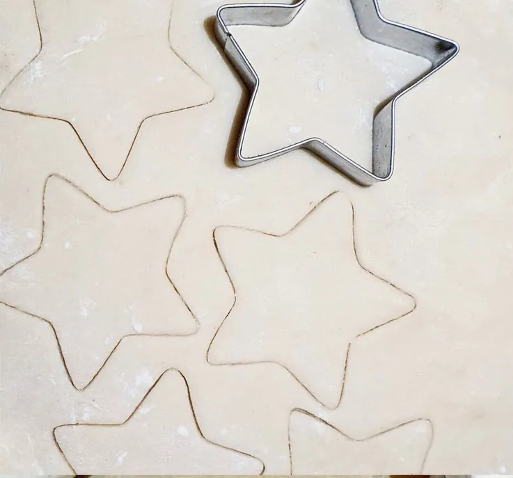 - Backpapier auslegen, mit etwas Bambusfaser bestreuen und den Teig mit Hilfe von weiterer Bambusfaser dünn ausrollen. Ich hatte 3mm Teigstärke. Mit dem Ausstecher Sterne ausstechen.