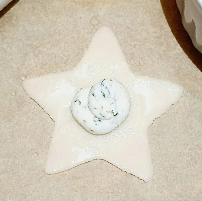 - Den oberen Teil auch befeuchten und die Sterne zusammensetzen. Die Ränder gut zusammendrücken, und mit etwas Wasser und Fingern glatt streichen.