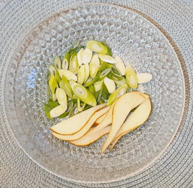 - In der Zwischenzeit, Frühlingszwiebel in Röllchen schneiden, und die Birne in Scheiben. Pekannuss längs zerkleinern. Pecorino in grobe Längsstreifen schneiden.