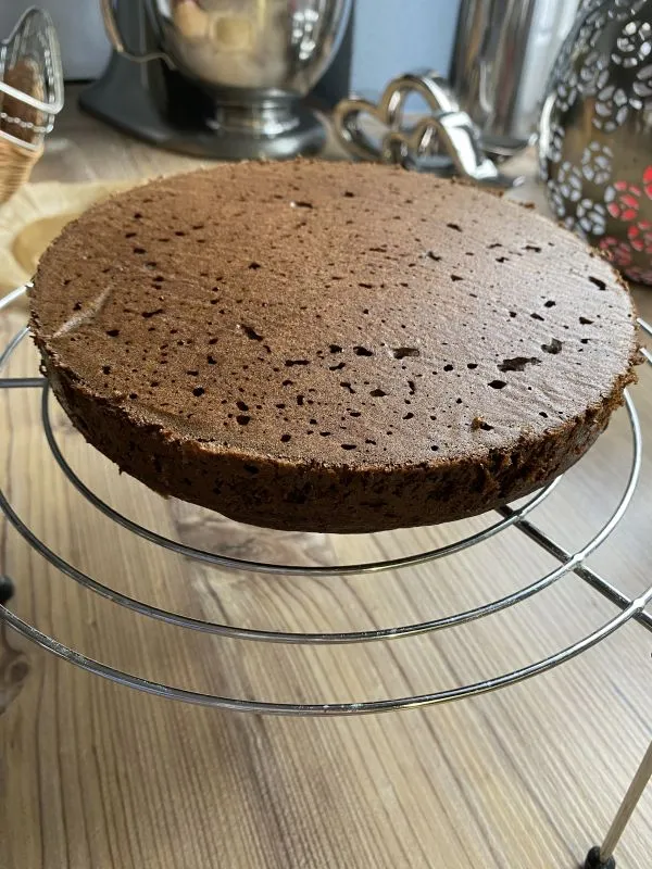 - Boden aus der Springform nehmen und umgedreht auf einem Kuchengitter auskühlen lassen. Dann wieder umdrehen wie gebacken.