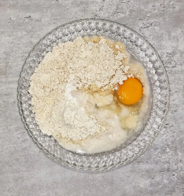 - Für den Boden Toastbrotmischung und Mandelteig miteinander vermischen. Salz, Ei und das lauwarmes Wasser versprudeln, Teigmischungen hinzufügen und einen Teig zubereiten. Geht mit einer Gabel einfach und schnell. Teig für 15 Minuten rasten lassen.