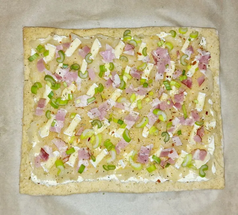 Flammkuchen mit einem herzhaften Belag aus Sauerkraut, Speck und verschiedenem Käse. Pro Stück 1g Kohlenhydrate.