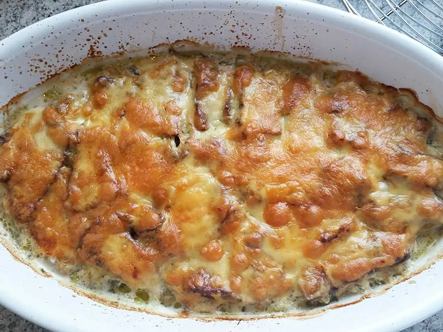 • Bei 190 °C ca. 10-15 min bei Umluft oder 20 min bei Ober- und Unterhitze backen bis der Käse leicht braun wird.